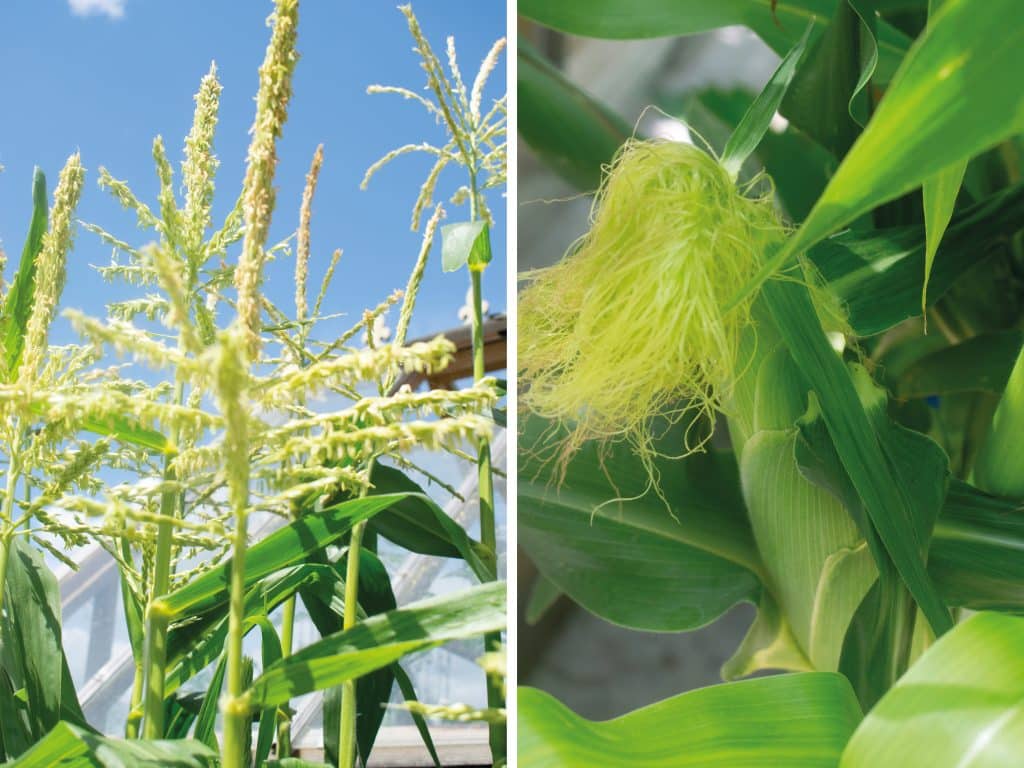A few weeks ago, the male flowerheads at the top of the plants opened and, in that time-honoured way, lavished their pollen upon the female flowers below. This is a process you can accelerate by simply shaking the stalks a little if desired. The ‘children of the corn’ (cobs) have now started to form and should be fully developed by late summer / early autumn.