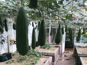 Elsewhere in the greenhouse there’s great news for those amongst you who like to wash! Dale’s loofahs have been positively basking in the heatwave. Here Dale reckons the 1Pot Systems have dealt him easily his biggest ever crop at this time of year with fruits beyond all expectation.