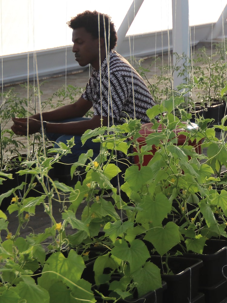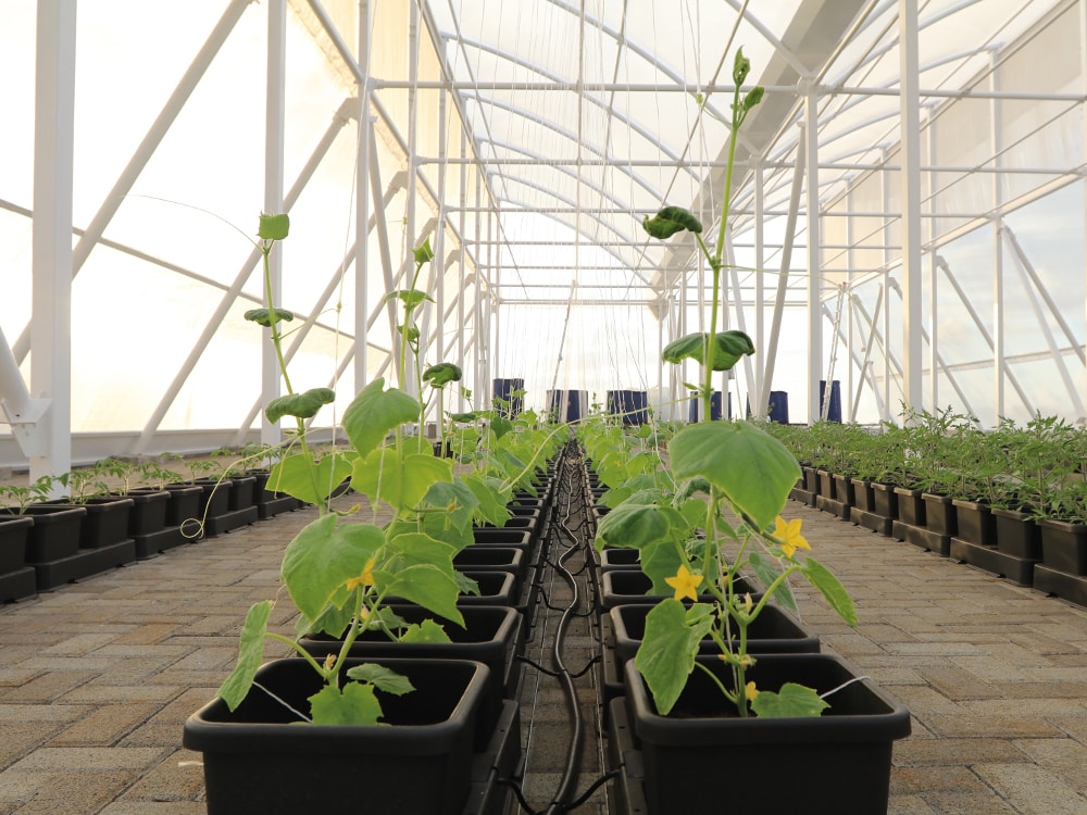 ABOVE: PEPPERS AND CUCUMBERS GROWN USING HIGH WIRE METHOD.