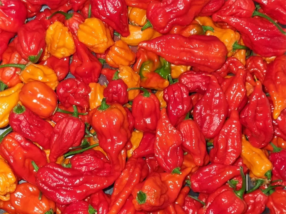 Speaking in tongues of flavoursome fire, Marc described some qualities of his core crop. ‘Scotch Bonnets, Habaneros, Trinidad Scorpions, Hurt Berries, Scotch Brains and Burmese Nagas have a lovely fruity flavour. Most other Nagas and Carolina Reapers have a floral flavour. Yellow Moruga have an almost musky but fruity flavour. Elephant Trunks are quite earthy and a little sweet once ripe. The fruitiness of the Scotch Bonnet tends to work best with Caribbean flavours and fruit based sauces. I find the floral taste of a Naga works best with Indian flavours and tomato based sauces.’Dextrously combining and manipulating the characteristics of chillies requires a ready, regular, and kaleidoscopic supply of fruit. Marc has these bases comprehensively covered.