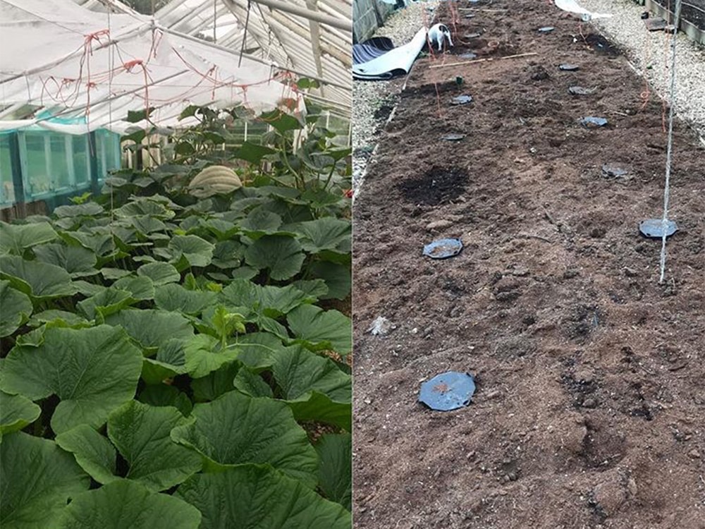 Elsewhere in the greenhouse Dale’s looking to produce a Cantaloupe with which you can’t elope. We certainly wouldn’t bet against him achieving that goal with 2019’s giant melon crop of choice. He has two plants, each ensconced in a 100 litre fabric SmartPot with the pots stood in large, open garden trays. These are being irrigated by easy2GO Kits and ably defended by AutoPot PlantSkirt. The PlantSkirt is a light-tight, heat-reflective shield that protects nutrient solution and substrate from temperature fluctuation, algae and debris when growing in large open trays. Paired with the easy2GO Kit it provides a solution for growing even the largest of plants. Look out for forthcoming news of the PlantSkirt’s imminent retail release. Dale is misting with beneficials to help encourage strong rooting, essential for his U.K. Record tilt.