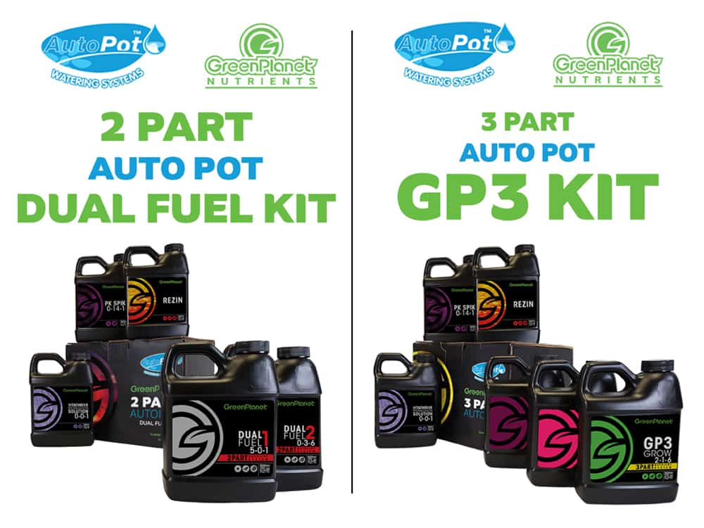 GreenPlanet have come up with a new line of AutoPot-optimised nutrient Starter Kits. Prepare to be thunderstruck by the absolutely spanking AP-GP liveried boxes in which you the happy grower can find either the 2-Part Dual Fuel combo, as used here, or a 3-Part set ft. the renowned GP3 feed.