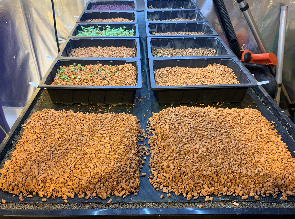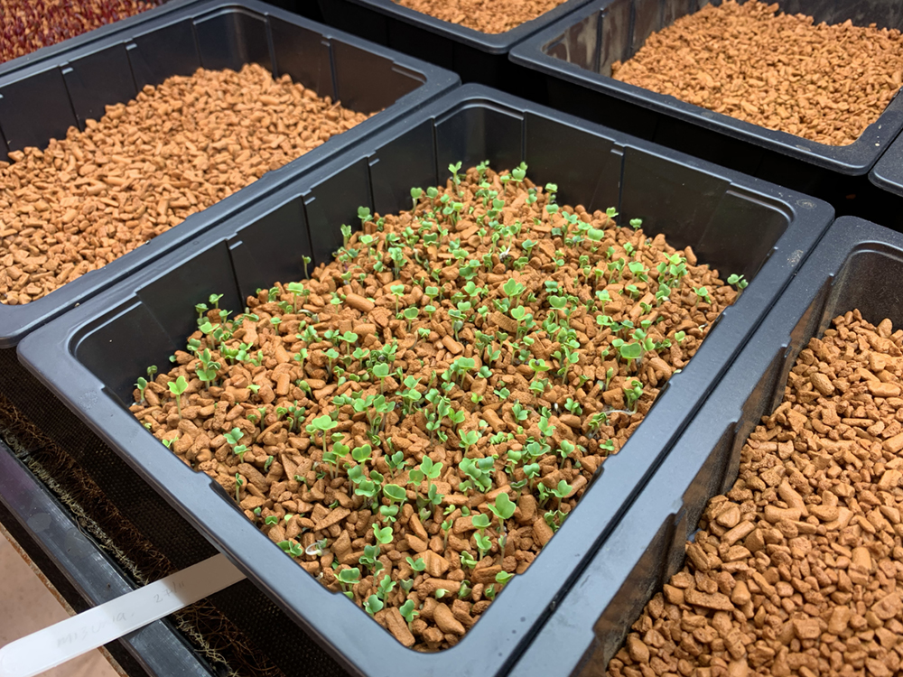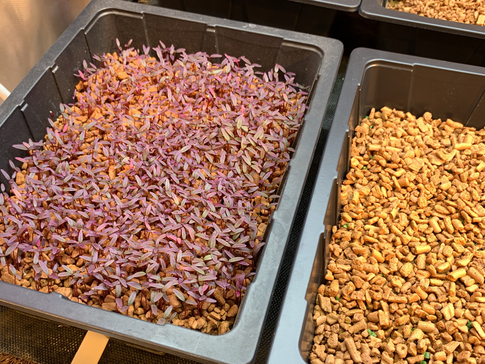 Jason has a variety of Seramis-based trials underway growing amaranth, basil, mizuma, Thai sweet basil, mustard, radish, coriander, and sweetcorn. Principal amongst the techniques employed is sowing into a small pile of the substrate which is sat directly on a root control sheet. The root control sheet sits top a CocoMat which is placed within a water-filled garden tray. CocoMat wicks all the moisture the plants need and can be left unattended for up to ten days – longer still if paired with an easy2GO Kit in the tray.