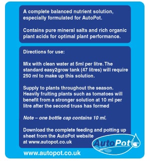 easy2grow liquid feed has been specially formulated to be used with all AutoPot Watering Systems and is perfect for use with all kinds of vegetables, fruit and plants. Many widely available liquid feeds provide a balanced feed for plants but leave large amounts of sediment/salt deposits in the tank that can be dragged through the pipes and into the AQUAvalves. This sediment causes unsuspected blockages and ultimately dead plants. A one part feed such as easy2grow Liquid Plant Fertiliser dilutes extremely well in water, remains mixed and does not separate and thus leaves minimal sediment.