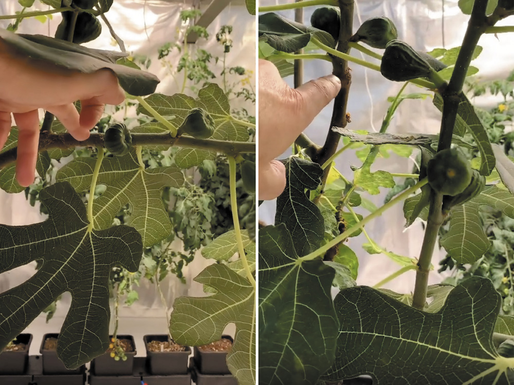 Figs are happy to oblige with fruit year-round when grown indoors and we’re very excited to get our first taste. However, a long and cautious wait is required as they only ripen on the tree. The fruit need to be hanging downwards and to have softened before we can even contemplate harvesting. Any fig that is perpendicular to the branches will taste pretty awful!